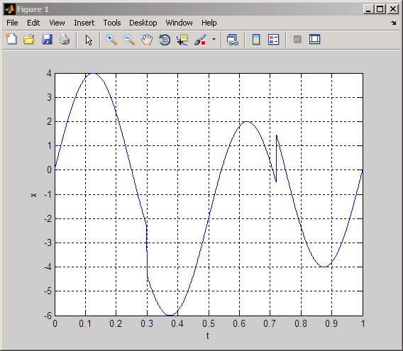 Обратите внимание на разрывы около t = 0,3 и t = 0,7.