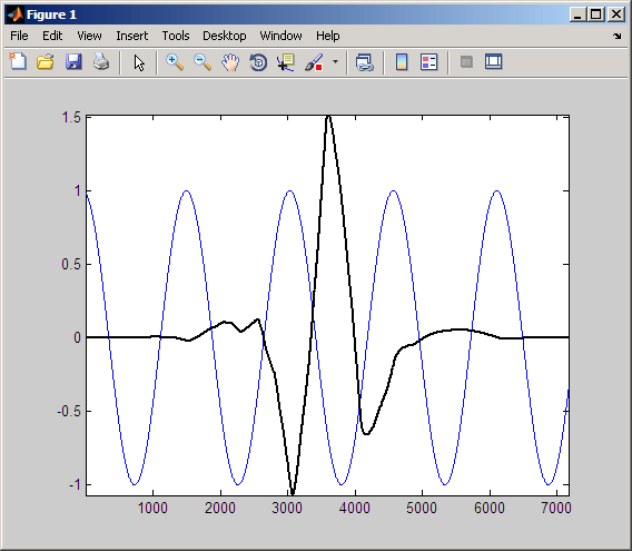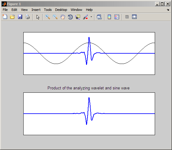 Можно видеть, что интеграция над этим продуктом дает отрицательный коэффициент CWT. Это происходит потому, что вейвлет находится в 1/2 цикла вне фазы с синусоидальной волной. Отрицательные отклонения импульса приблизительно совпадают с положительными отклонениями синусоидальной волны. Положительные отклонения импульса приблизительно совпадают с отрицательными отклонениями синусоиды.