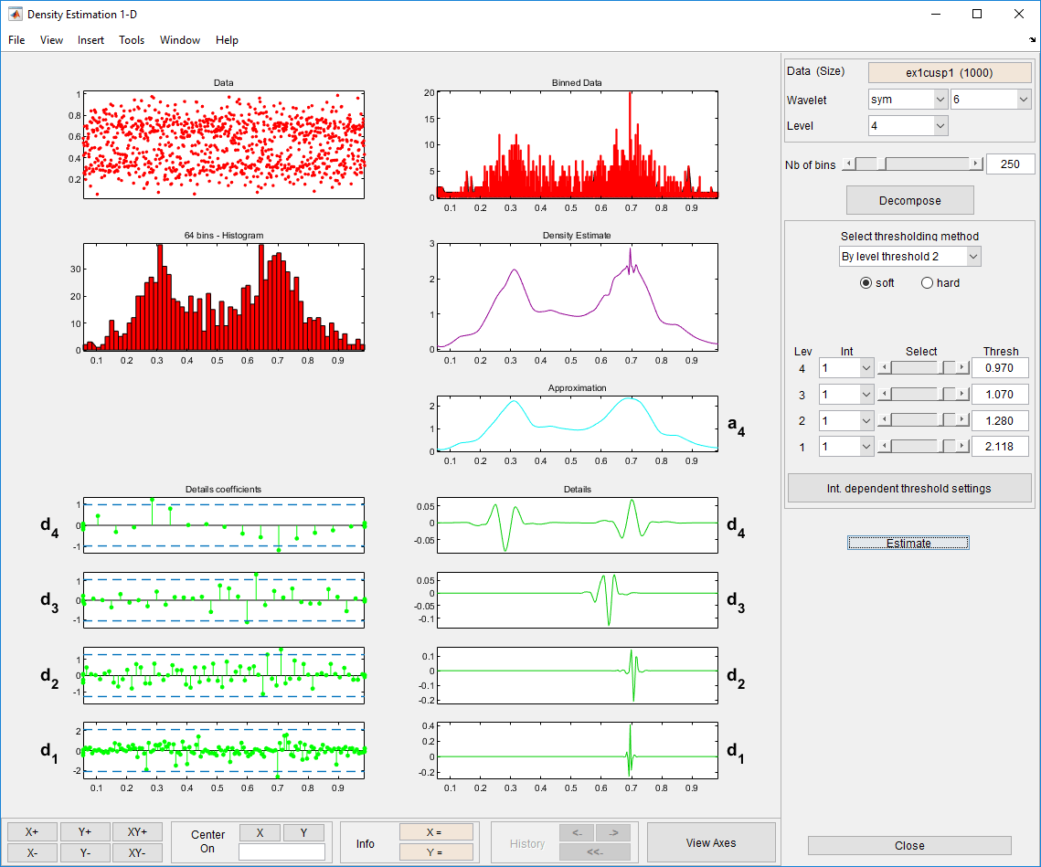 Панель инструментов предоставляет приложение Wavelet Analyzer для оценки плотности образца и дополнения хорошо известных инструментов, таких как гистограмма (доступная из ядра MATLAB ®) или оценки на основе ядра.