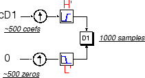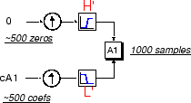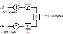 Обратите внимание, что векторы коэффициентов cA1 и cD1 - потому что они были получены путем понижающей дискретизации и составляют только половину длины исходного сигнала - не могут быть непосредственно объединены для воспроизведения сигнала. Необходимо реконструировать приближения и детали, прежде чем объединять их.