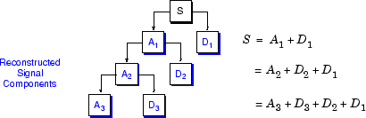 Распространяя этот метод на компоненты многоуровневого анализа, мы находим, что аналогичные отношения сохраняются для всех восстановленных составляющих сигнала. То есть существует несколько способов повторной сборки исходного сигнала: