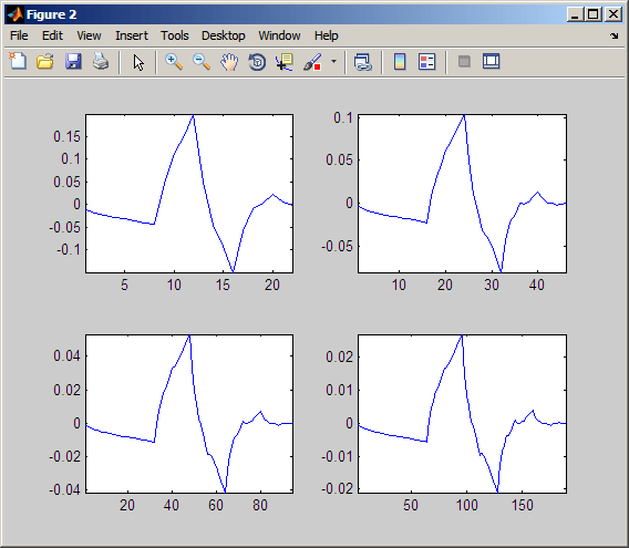 L = dbaux(2); H = wrev(L).*[1 -1 1 -1]; HU = dyadup(H,0); HU = conv(HU,L); plot(HU); title('1st Iteration'); H1 = conv(dyadup(HU,0),L); H2 = conv(dyadup(H1,0),L); H3 = conv(dyadup(H2,0),L); H4 = conv(dyadup(H3,0),L); figure; for k =1:4 subplot(2,2,k); eval(['plot(H' num2str(k) ')']); axis tight; end