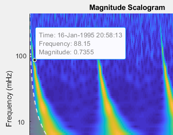 Чтобы увидеть время, частоту и величину точки скалограммы, включите подсказки данных на панели инструментов осей рисунков и щелкните нужную точку в скалограмме.