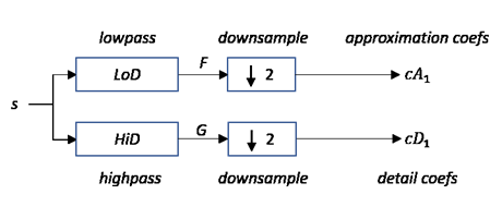 Начиная с сигнала s длиной N вычисляются два набора коэффициентов: коэффициенты аппроксимации cA1 и коэффициенты детализации cD1. Свертывание s с помощью фильтра масштабирования LoD, с последующим диадическим прореживанием, дает коэффициенты аппроксимации. Аналогично, свертывание s с вейвлет-фильтром HiDс последующим диадическим прореживанием дает коэффициенты детализации.