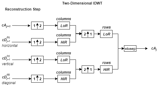Алгоритм 2-D вейвлет-реконструкции для изображений аналогичен одномерному случаю. Двумерные вейвлет-функции и функции масштабирования получают, принимая тензорные произведения одномерных вейвлет-функций и функций масштабирования. Этот вид двумерного обратного DWT приводит к реконструкции коэффициентов аппроксимации на уровне j из четырёх составляющих: аппроксимации на уровне j + 1, и деталей в трёх ориентациях (горизонтальной, вертикальной и диагональной). На следующей диаграмме описаны основные шаги реконструкции изображений.