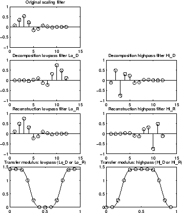 где qmf таков, что Hi_R и Lo_R - квадратурные зеркальные фильтры (т. е. Hi_R(k) = (-1)kLo_R(2N + 1 - k), для k = 1, 2, Ä, 2N) и где wrev разворачивает коэффициенты фильтра. Так Hi_D и Lo_D также являются квадратурными зеркальными фильтрами. Вычисление этих фильтров выполняется с помощью orthfilt.