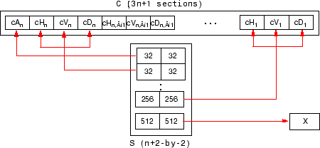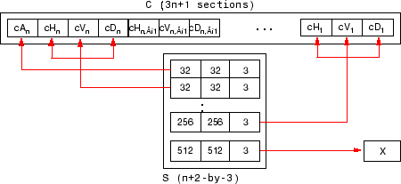 [ возвращает вейвлет-декомпозицию матрицы C,S] = wavedec2(X,N,wname)X на уровне N использование вейвлета wname. Структура выходной декомпозиции состоит из вектора вейвлет-декомпозиции C и матрица бухгалтерского учета S, который содержит количество коэффициентов по уровню и ориентации.