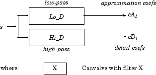 Общий этап j свертывает коэффициенты аппроксимации на уровне j-1 с усиленными вариантами соответствующих исходных фильтров для получения коэффициентов аппроксимации и детализации на уровне j. Это можно визуализировать на следующем рисунке.