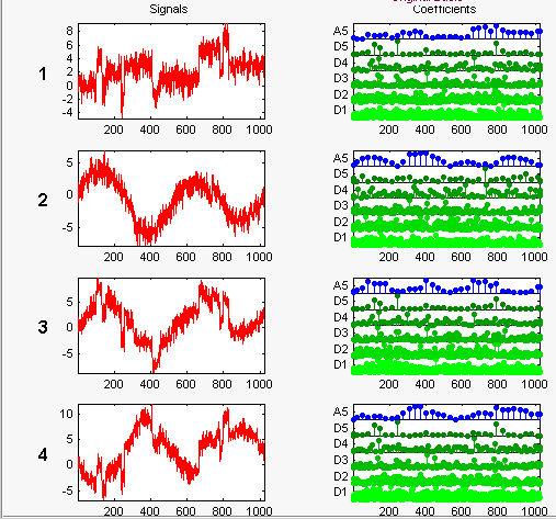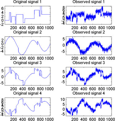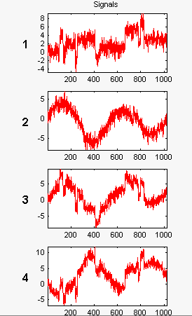 Эти сигналы являются шумными версиями из простых комбинаций двух исходных сигналов. Первый является «блоками», которые являются нерегулярными, а второй - «Sine», который является регулярным, за исключением приблизительно времени 750. Два других сигнала представляют собой сумму и разность между исходными сигналами. Многомерный гауссовский белый шум, проявляющий сильную пространственную корреляцию, добавляется к результирующим четырем сигналам.