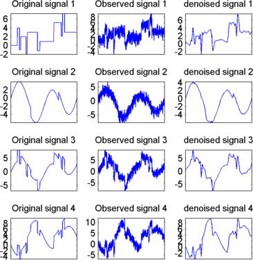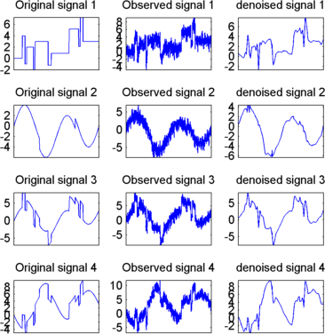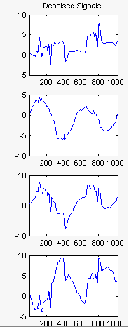 Результаты удовлетворительные. Фокусируясь на двух первых сигналах, заметьте, что они правильно восстановлены, но результат может быть улучшен за счет использования преимуществ взаимосвязей между сигналами, приводящих к дополнительному деноизирующему эффекту.