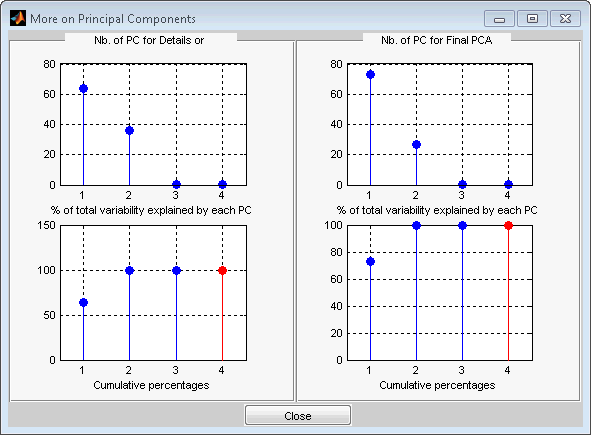 На новом рисунке отображается информация для выбора количества компонентов, сохраняемых для PCA аппроксимаций и для окончательного PCA после возврата к исходной основе. Можно просмотреть процент изменчивости, объясняемый каждым основным компонентом и соответствующим кумулятивным графиком. Здесь очевидно, что интерес представляют только два основных компонента.