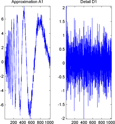 При этом генерируются коэффициенты аппроксимации уровня 1 (swa) и детализации (swd). Оба имеют одинаковую длину с сигналом. Напечатать
