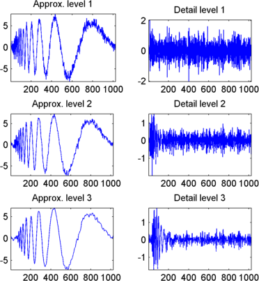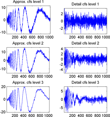 Это генерирует коэффициенты аппроксимаций на уровнях 1, 2 и 3 (swa) и коэффициенты деталей (swd). Обратите внимание, что строки swa и swd имеют ту же длину, что и длина сигнала. Напечатать