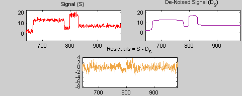 lev = 5; swc = swt(s,lev,'db1'); swcden = swc; swcden(1:end-1,:) = wthresh(swcden(1:end-1,:),sorh,thr); clean = iswt(swcden,'db1');