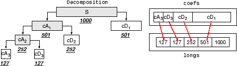 Переменная coefs должен быть вектором коэффициентов DWT (сцепленных для различных уровней) и переменной longs вектор, задающий длину каждого компонента coefs, а также длину исходного сигнала.