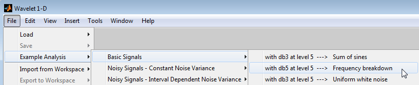 Чтобы загрузить этот сигнал в инструмент Wavelet 1-D, используйте пункт меню File > Load > Signal.