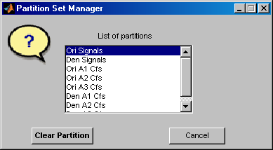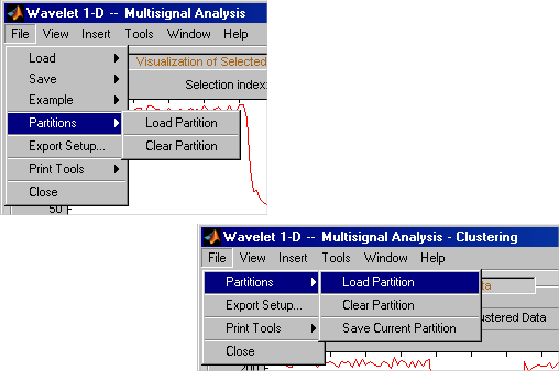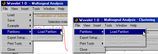 Чтобы загрузить или очистить сохраненные разделы, используйте команду Файл (File) > Разделы (Partitions) в инструменте Wavelet 1-D Multisignal Analysis. (Файл> Разделение также доступно в Небольшой волне 1-D Аналитический инструмент Объединения в кластеры Мультисигнала, и Вы можете также спасти текущее разделение.)