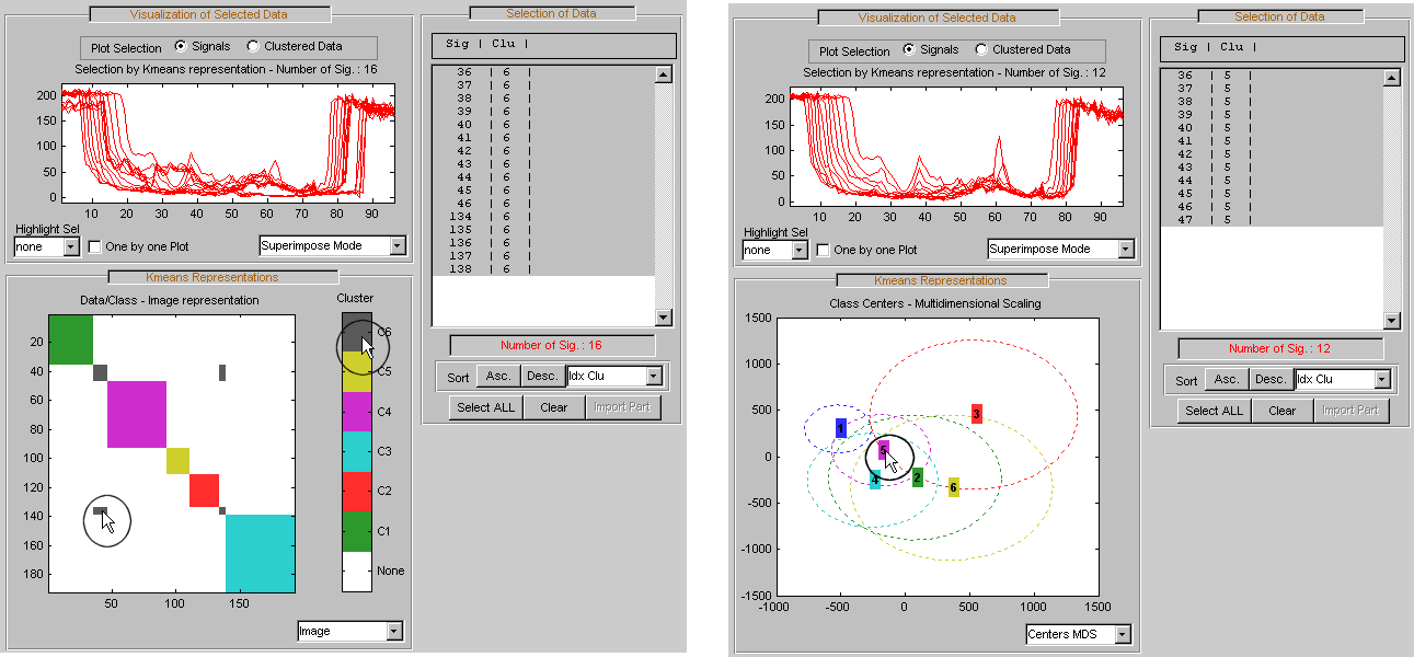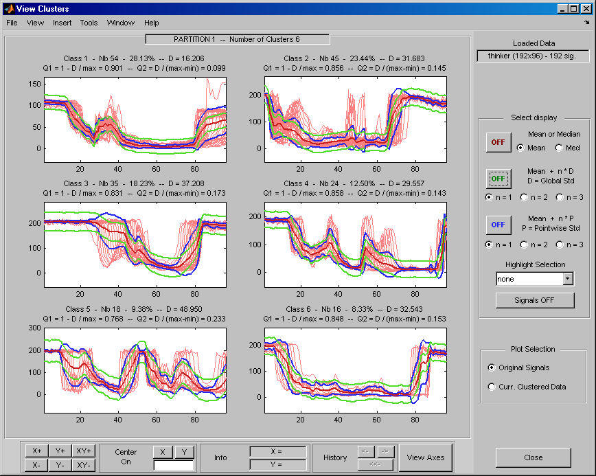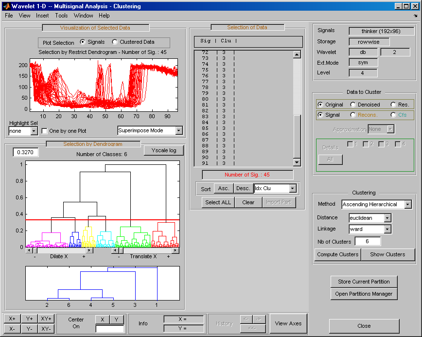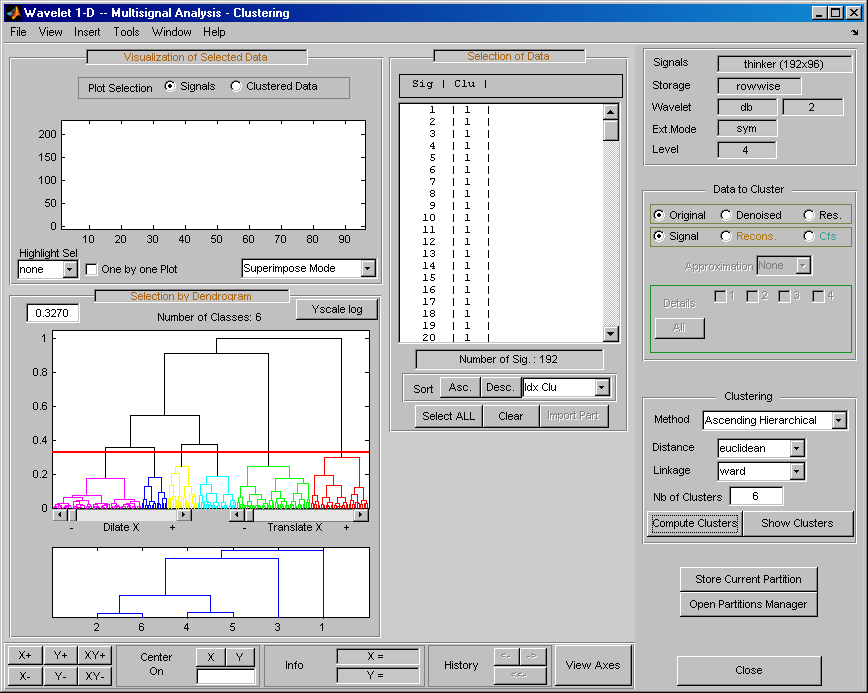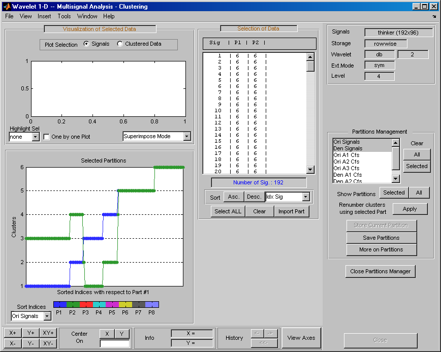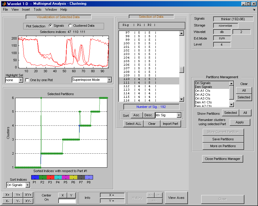 Теперь можно использовать три раздела для примера Ex 21: Thinker (строки). Затем можно загрузить разделы, сохраненные в файле newPART.mat в основном инструменте Wavelet 1-D Multisignal Analysis и в инструменте кластеризации.
