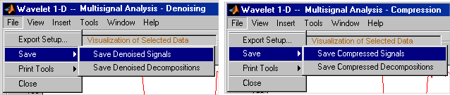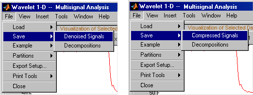 На диск можно сохранять декомпозиции и деноузированные или сжатые сигналы (включая соответствующие декомпозиции из инструментов Wavelet 1-D Multisignal Analysis). Затем можно манипулировать данными, а затем импортировать их снова в графические инструменты.