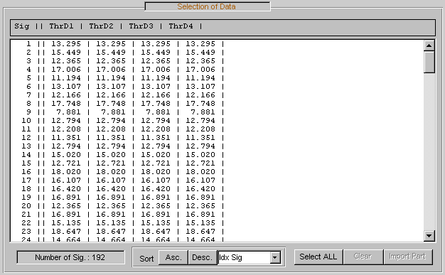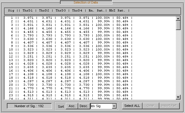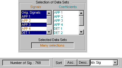 В каждой строке списка отображается индекс выбираемого сигнала (Idx Sel), индекс исходного сигнала (Idx Sig) и три атрибута вейвлет-преобразования, описывающие процесс, используемый для получения выбираемого сигнала из исходного.