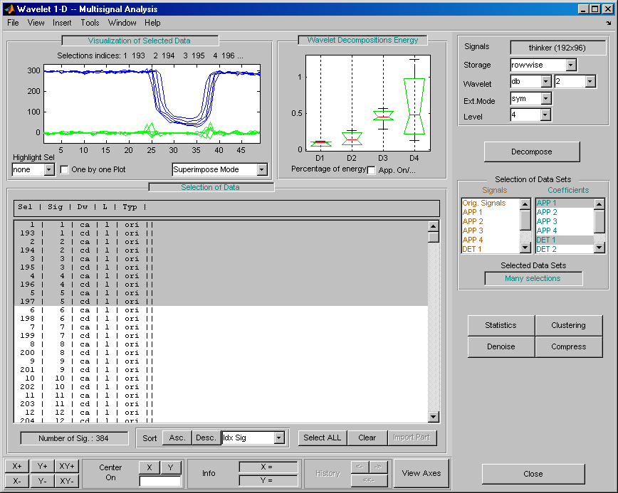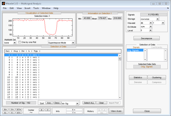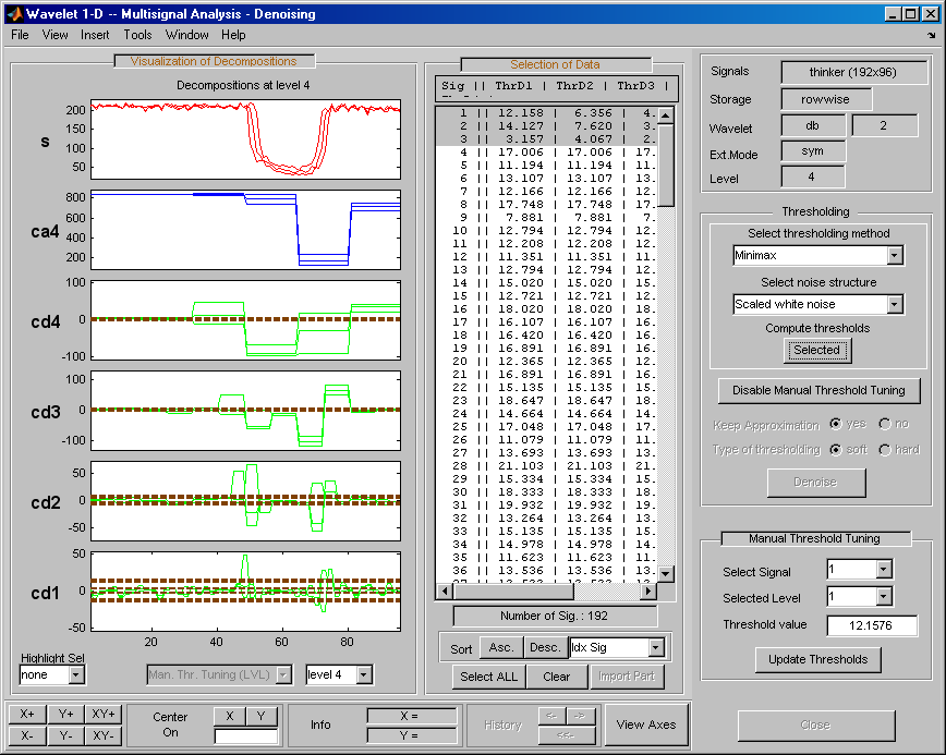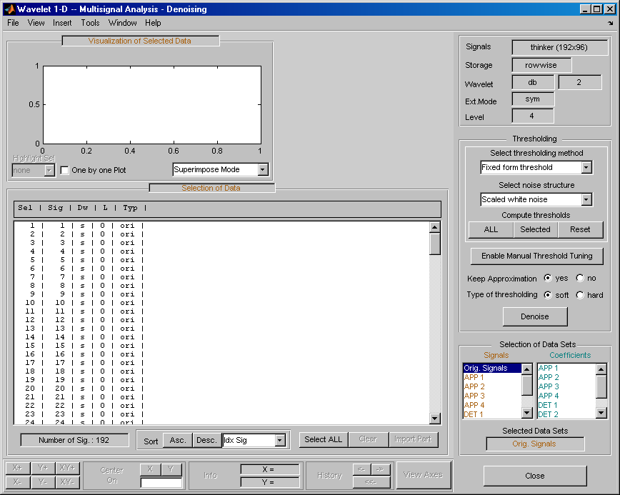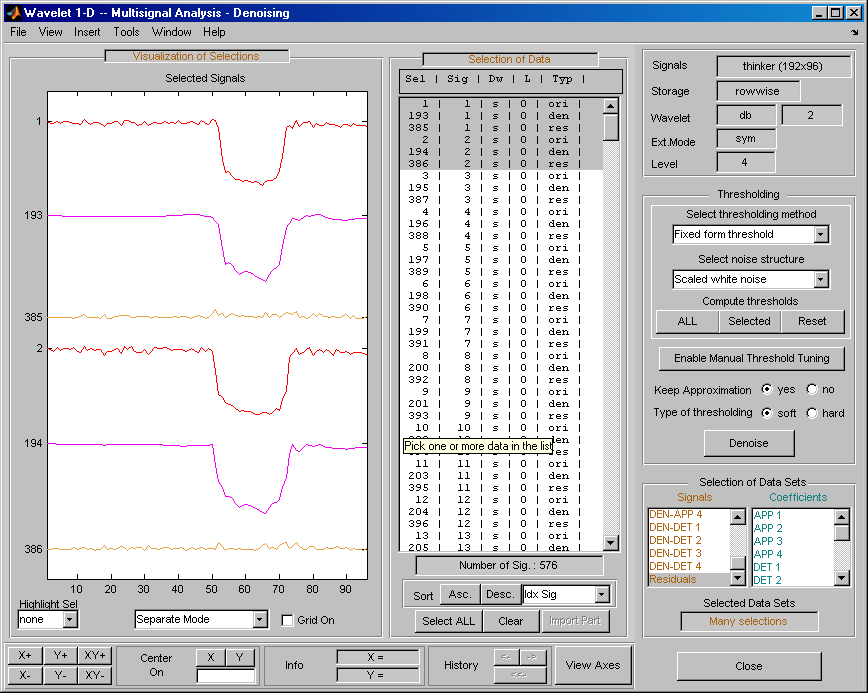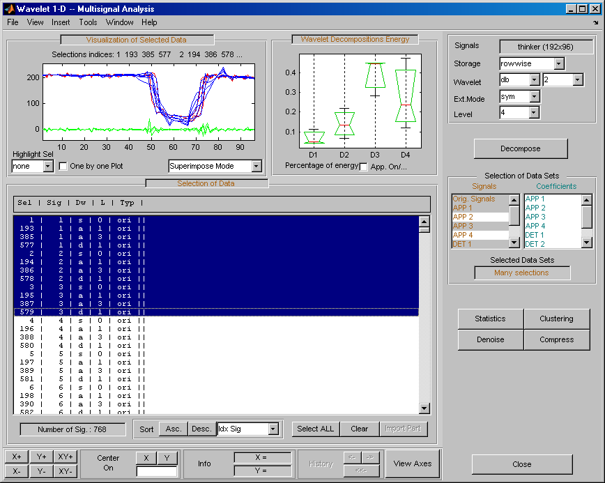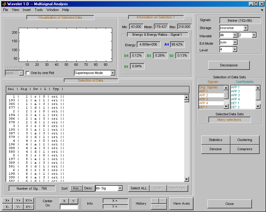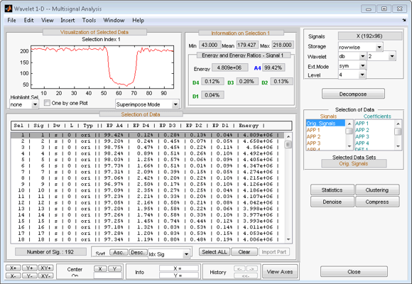 Откройте основной инструмент Wavelet 1-D Multisignal Analysis и загрузите пример анализа с помощью команды File > Example > Ex 21: Thinker (строки).