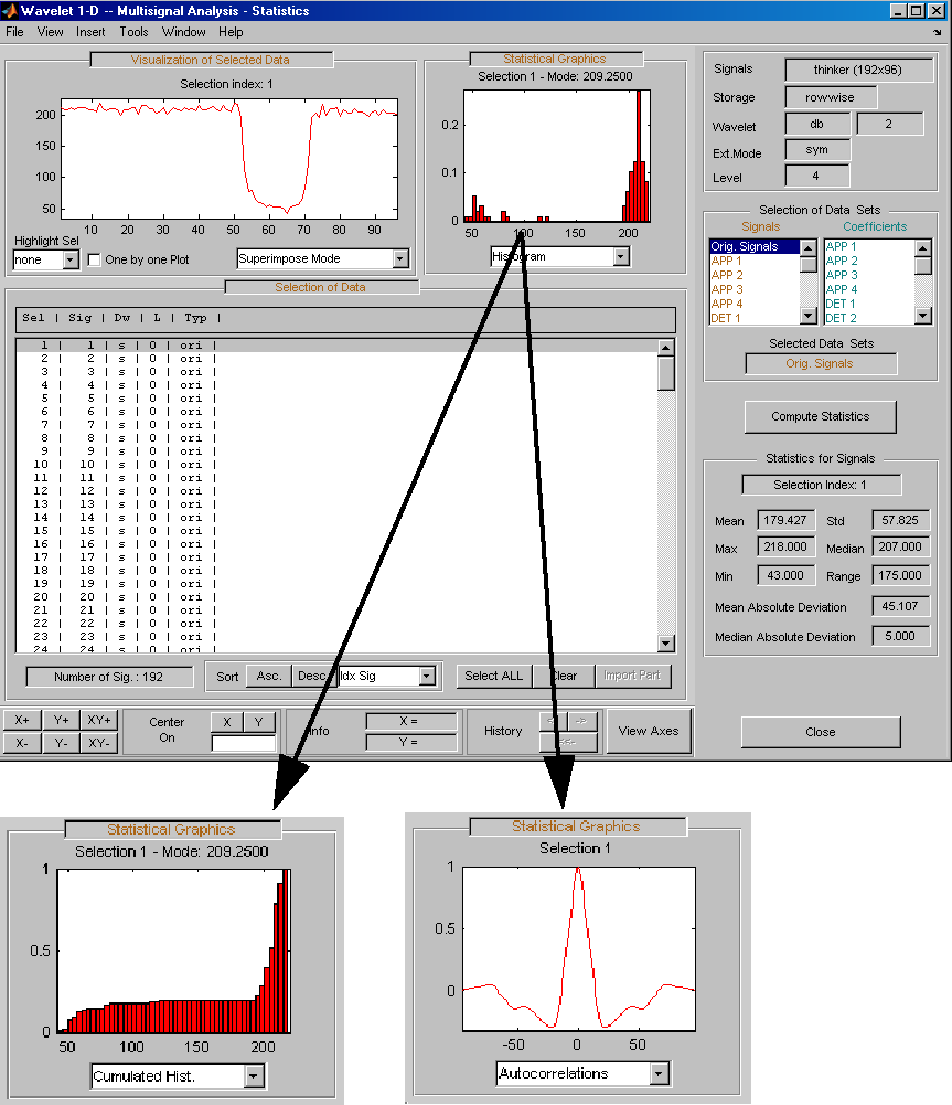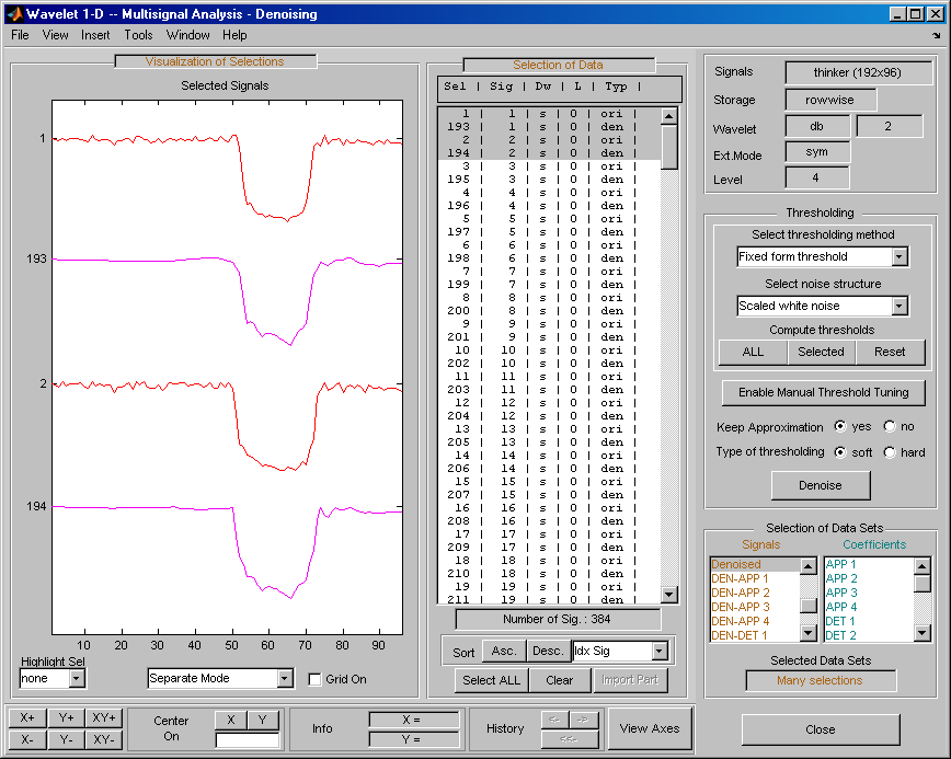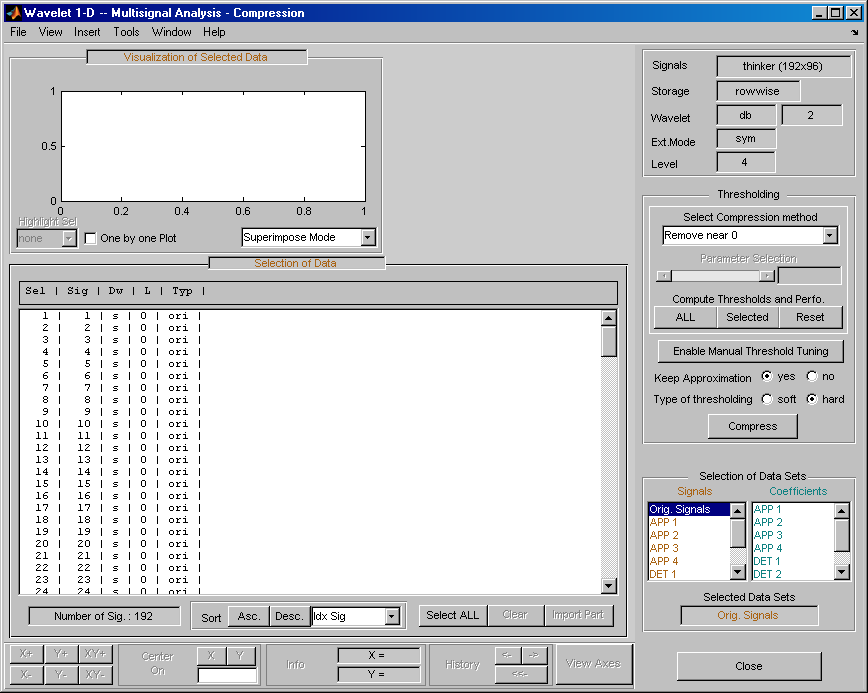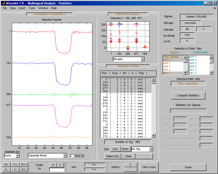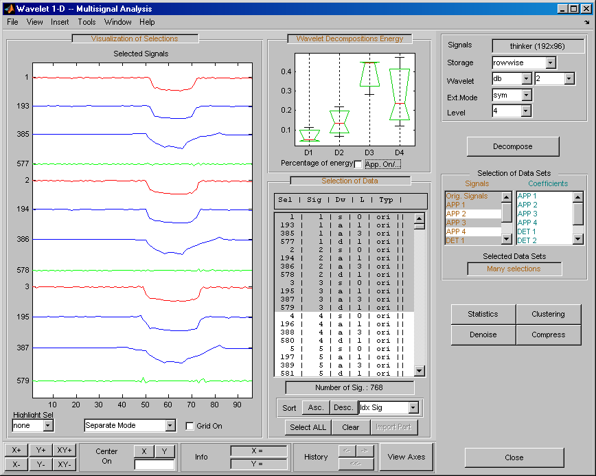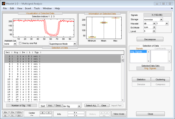 Откройте основной инструмент Wavelet 1-D Multisignal Analysis и загрузите пример анализа с помощью команды File > Example > Ex 21: Thinker (строки).