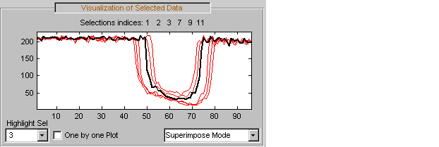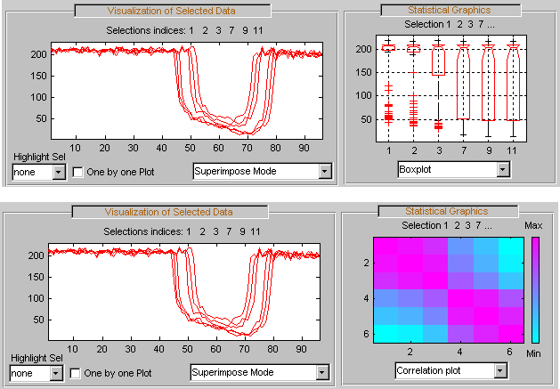 Выбранные сигналы (1, 2, 3, 7, 9 и 11) появляются на панели Визуализация выбранных данных (Visualization of Selected Data). Панель Информация о выбранных данных (Information on Selected Data) содержит прямоугольные графики минимумов, средств и максимумов этих сигналов.