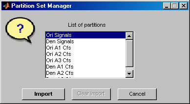 В каждый подкомпонент инструмента Wavelet 1-D Multisignal Analysis (основной, статистика, деноизирование, сжатие, кластеризация) можно импортировать сохраненный раздел из списка на панели Выбор данных. Нажмите кнопку Импорт детали в нижней части панели Выбор данных (Selection of Data), откроется окно Диспетчер наборов разделов (Partition Set Manager). Выберите один раздел и нажмите кнопку Импорт.