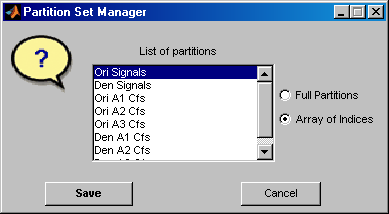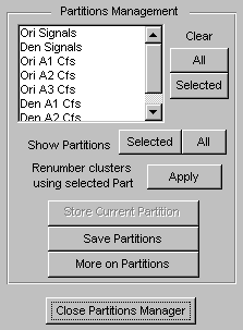 Нажмите кнопку «Сохранить текущий раздел» под панелью «Кластеризация», чтобы сохранить текущий раздел для дальнейшего сравнения. Предлагается имя по умолчанию. Обратите внимание, что 1-D Аналитический инструмент Мультисигнала Небольшой волны хранит разделение, и они не спасены на диске.