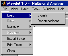 В графический интерфейс можно загружать сигналы или разложения. Загружаемая информация может быть ранее экспортирована из графического интерфейса, а затем обработана в рабочей области; или это может быть информация, первоначально созданная из командной строки. В любом случае необходимо соблюдать строгие форматы файлов и структуры данных, используемые инструментами Wavelet 1-D Multisignal Analysis, или при попытке загрузить информацию возникнут ошибки.