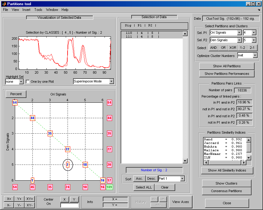 Статистика, измеряющая сходство разделов P1 и P2 отображаются на панелях справа. Панель Partitions Pairs Links подсчитывает пары сигналов. Два сигнала x и y считаются парой, если они находятся в одном кластере. Для любых двух сигналов x и y, есть четыре возможности.