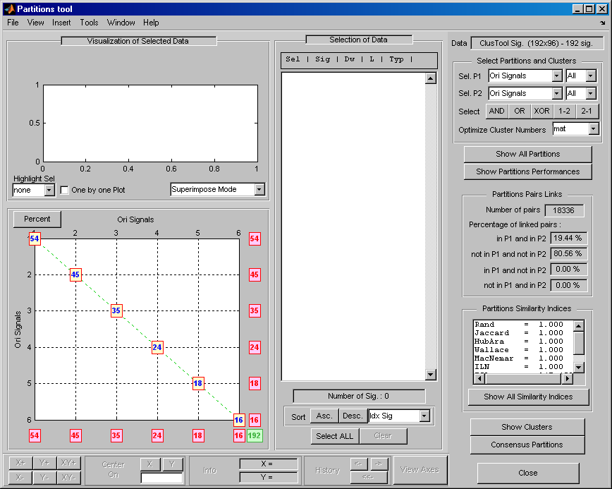 Можно сравнить разделы с помощью инструмента «Раздел». Чтобы отобразить инструмент «Раздел», нажмите кнопку «Дополнительно» в нижней части панели «Управление разделами». По умолчанию при открытии инструмента «Раздел» выбранный раздел в данном случае Ori Signals, сравнивается с самим собой. В левом нижнем графике целое число N в (i,j) означает, что существует группа N сигналы в iтретий кластер P1 и jтретий кластер P2. Поскольку инструмент «Секционирование» сравнивает раздел с самим собой, все числа отображаются на главной диагонали.