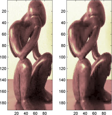 figure; subplot(1,2,1); image(X) subplot(1,2,2); image(XX) colormap(pink(222))