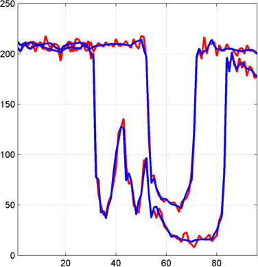 decTER = chgwdeccfs(dec,'cd',0,1:2,31:35); Y = mdwtrec(decTER,'a',0,31); figure; plot(X([1 31],:)','r','linewidth',2); hold on plot([Xbis(1,:) ; Y]','b','linewidth',2); grid; set(gca,'Xlim',[1,96])