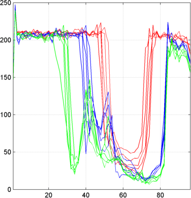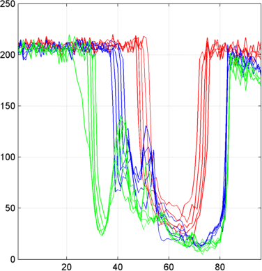 Xbis = mdwtrec(decBIS); figure; plot(Xbis(1:5,:)','r'); hold on plot(Xbis(21:25,:)','b'); plot(Xbis(31:35,:)','g') grid; set(gca,'Xlim',[1,96])