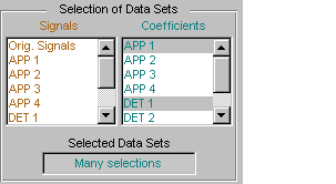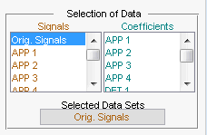 Панель «Выбор данных» содержит список выбираемых сигналов. В начале доступны только первоначально загруженные сигналы. Можно генерировать и добавлять новые сигналы в список путем разложения, сжатия или обесценения исходных сигналов.