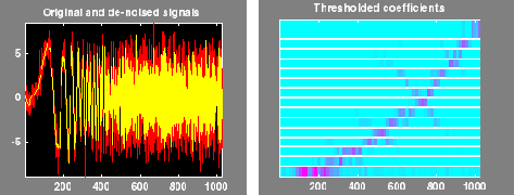 Результаты операции снятия шума являются достаточно хорошими, что можно видеть, глядя на пороговые коэффициенты. Частота сигнала частотно-частотной модуляции увеличивается квадратично с течением времени, и пороговые коэффициенты по существу захватывают квадратичную кривую во временной-частотной плоскости.