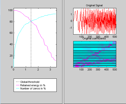Это пороговое значение означает, что любой элемент сигнала, значение которого меньше 1,482, будет установлен в ноль при выполнении сжатия.