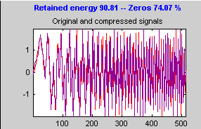 Если попытаться сжать тот же сигнал с помощью вейвлетов с точно такими же параметрами, сохраняется только 89% энергии сигнала, и только 59% вейвлет-коэффициентов установлены на ноль. Это иллюстрирует превосходство вейвлет-пакетов для выполнения сжатия, по меньшей мере, для определенных сигналов.