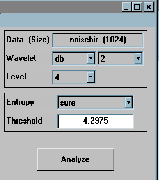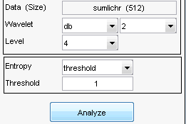 Установите соответствующие параметры для анализа. Выберите db2 вейвлет, уровень 4, энтропия thresholdи для типа порогового параметра 1. Нажмите кнопку «Анализ».