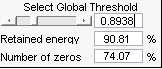 Элементы управления пороговыми значениями расположены справа (см. красную рамку на рисунке выше). Отметим, что автоматический порог 1,482 приводит к сохранению энергии всего 81,49%. Это может вызвать неприемлемые величины искажения, особенно в пиковых значениях колебательного сигнала. В зависимости от критериев проектирования можно выбрать пороговое значение, сохраняющее больше энергии исходного сигнала.
