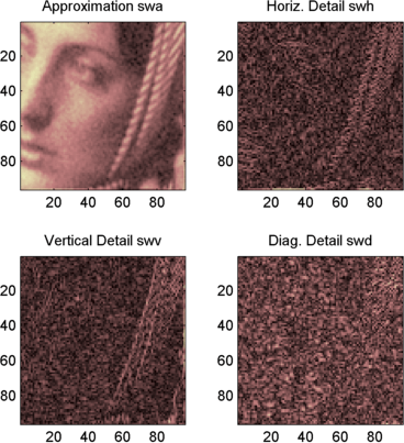 Это генерирует матрицы коэффициентов аппроксимации первого уровня (swa) и горизонтальные, вертикальные и диагональные детали (swh, swv, и swdсоответственно). Оба имеют размер - размер изображения. Напечатать