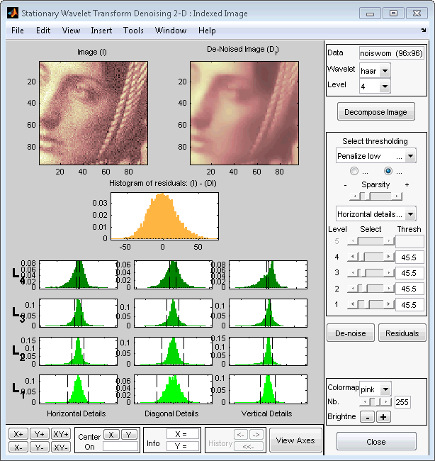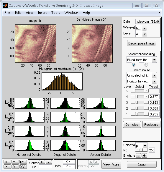 Обесцененное изображение X и map - цветовая карта. Кроме того, имеются параметры процесса обессоливания. Имя вейвлета содержится в wnameи пороговые значения, зависящие от уровня, кодируются в valTHR. Переменная valTHR имеет четыре столбца (уровень разложения) и три строки (по одной для каждой ориентации детализации).