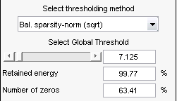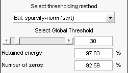 Нажмите кнопку Compress, чтобы открыть окно Wavelet Packet 2-D Compression. Выберите Bal. параметр sparsity-norm (sqrt) в меню метода выбора пороговых значений.