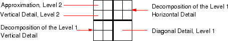 Этот график показан в правой нижней части инструмента Wavelet Packet 2-D. График показывает нам, какие детали были разложены, а какие нет. Большие квадраты представляют детали, которые не были разбиты на столько уровней, как меньшие квадраты. Рассмотрим, например, эту схему разложения уровня 2: