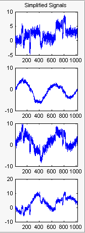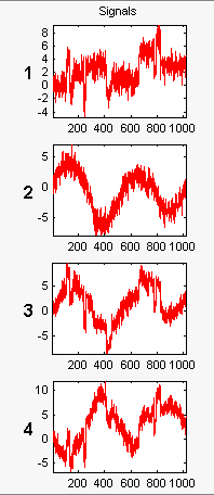 Эти сигналы являются шумными версиями из простых комбинаций двух исходных сигналов, Blocks и CharcSine и их суммы и разности, каждый с добавленным многомерным гауссовым белым шумом.