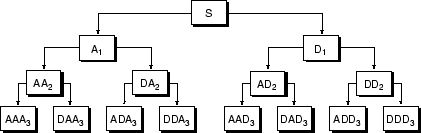 В соответствующей ситуации с вейвлет-пакетом каждый вектор коэффициента детализации также разлагается на две части с использованием того же подхода, что и при разделении вектора аппроксимации. Это предлагает самый богатый анализ: создается полное двоичное дерево, как показано на следующем рисунке.