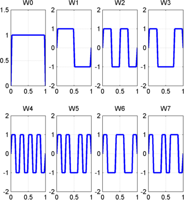 W0(x) = φ(x) является функцией масштабирования Хаара и W1(x) = ψ(x) является вейвлетом Хаара, поддерживаемым в [0, 1]. Затем мы можем получить W2n путем добавления двух 1/2 масштабированных версий Wn с различными опорами [0,1/2] и [1/2,1] и получить W2n + 1 путем вычитания тех же версий Wn.