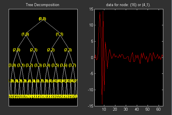 plot(T)Постройте график двоичного вейвлет-дерева пакетов и щелкните по (4,1) дублету (узел 16).