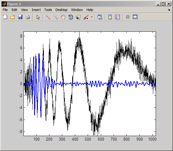 rwpc = wprcoef(T,16); % rwpc is length 1024 plot(noisdopp,'k'); hold on; plot(rwpc,'b','linewidth',2); axis tight;